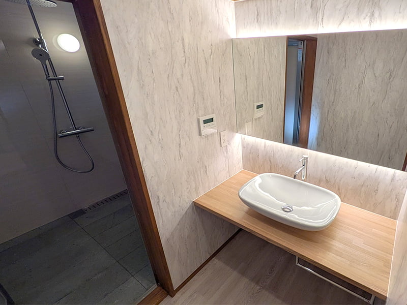 浴室に配した笏谷石と越前焼陶板の質感。